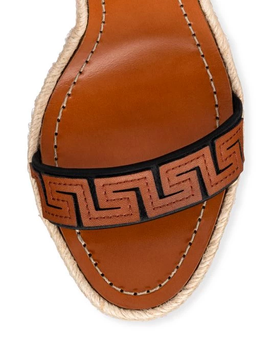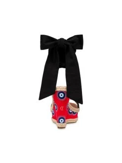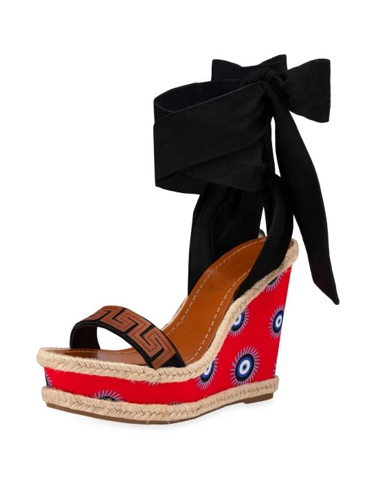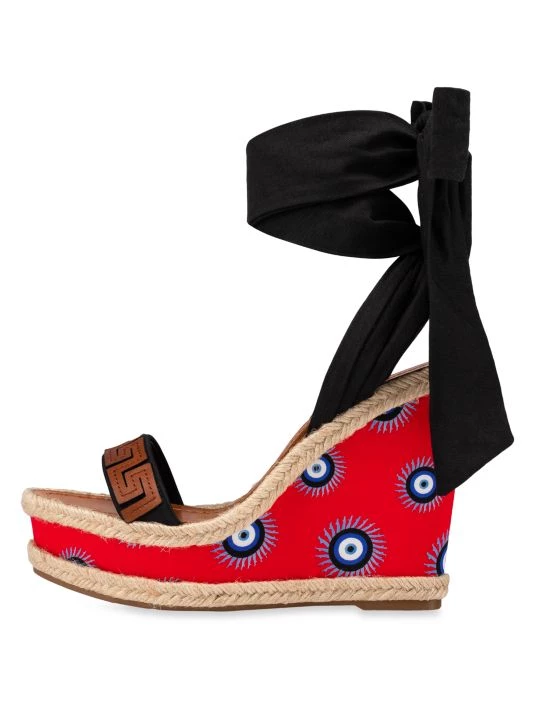 These chic wedge sandals boast an evil eye motif, styled with a self-tie at the ankle.