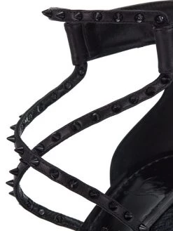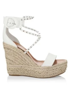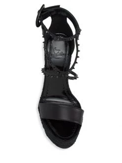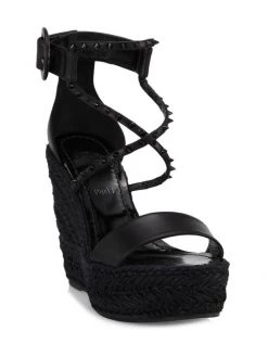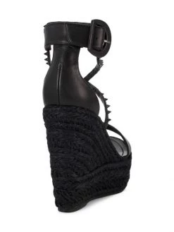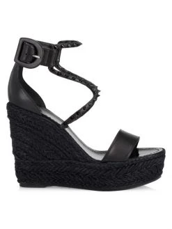 Christian Louboutin’s Chocazeppa sandals are adorned with a braided-raffia wedge heel. This style is detailed with tonal signature spikes atop crisscross straps.