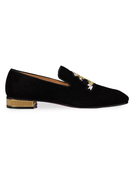 These elegant Christian Louboutin smoking slippers feature a regal logo patch stitched to the vamp. A textured, goldtone block heel adds a luxurious, elevated effect.