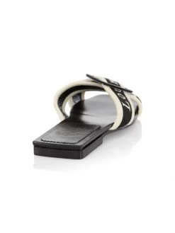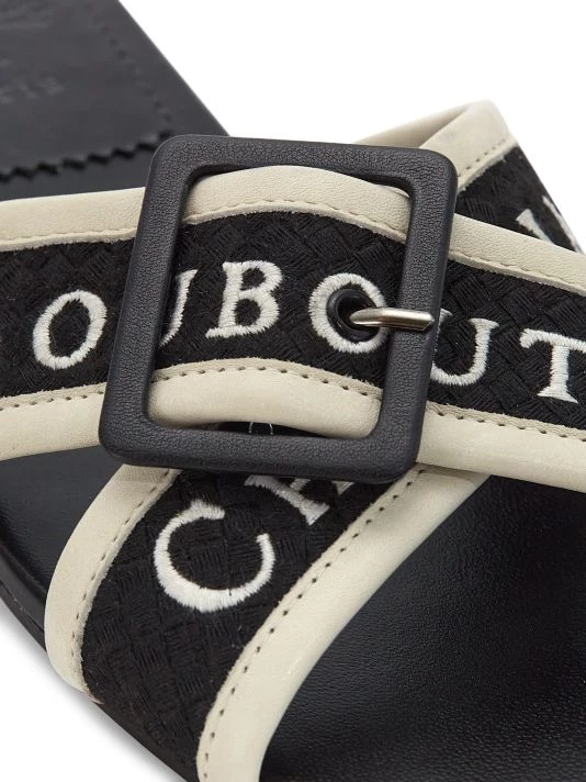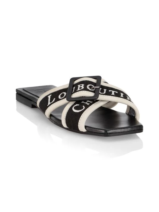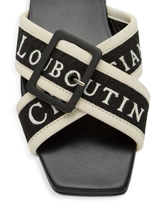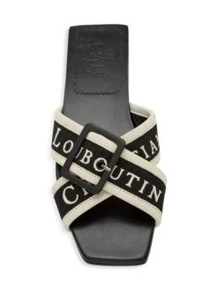 Made in Italy, Christian Louboutin’s Crossimule sandals are crafted of leather. This slide style is adorned with crisscross logo vamp straps with a buckle accent.