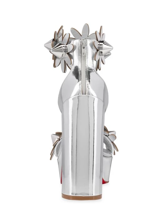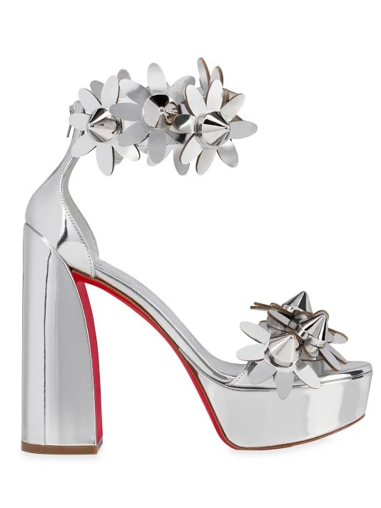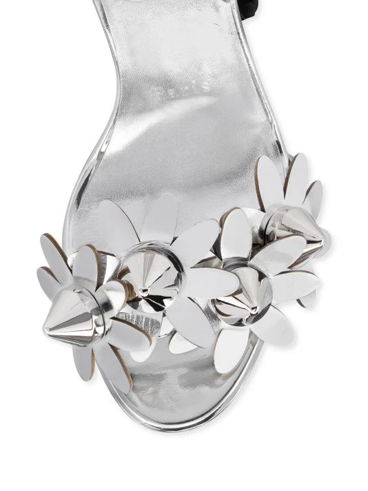 Set on top of a statement block heel, these leather sandals bloom with daisy-inspired appliqués on straps with studded silvertone accents.