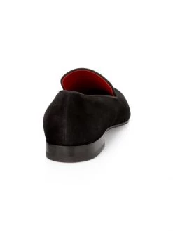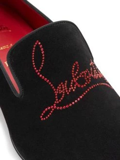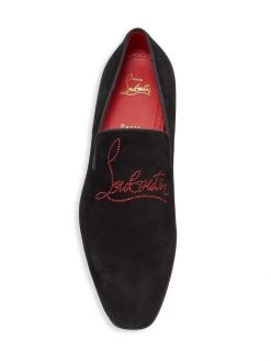 A rhinestone-embellished Louboutin logo across the vamp adds a soft glimmer to these supple suede loafers.