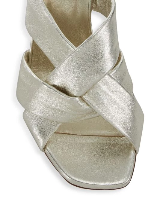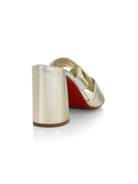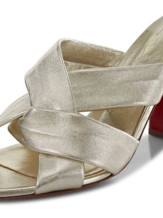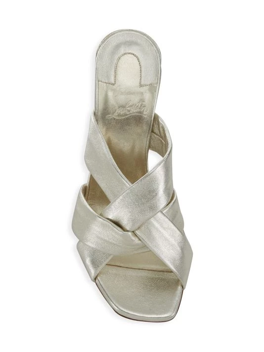 Metallic leather mules with a crisscross vamp and a chunky inverted block heel.