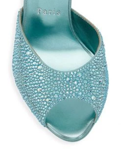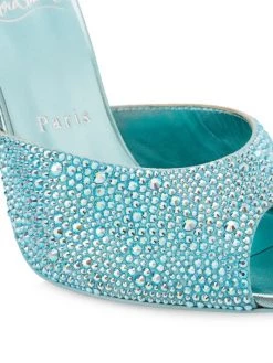 Made in Italy, Christian Louboutin’s Dolly mules are crafted of metallic leather. This eye-catching style is adorned with strass crystals on the vamp with a peep-toe design.