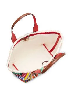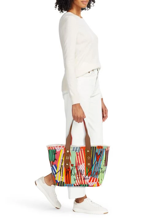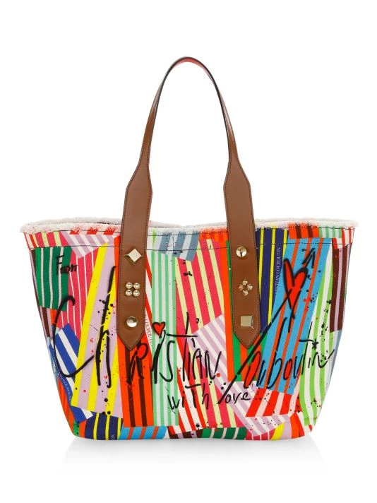 Highlighted with a hand-drawn logo, Christian Louboutin’s Frangibus tote is crafted of canvas decorated with multicolored stripes. This Italian-made piece is finished with leather handles reinforced by signature mixed studs.