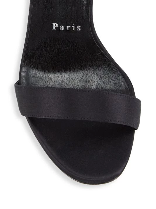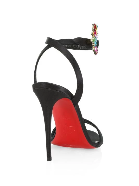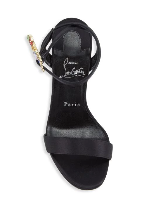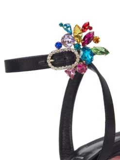 Highlighted with multicolor crystals at slender buckle strap, these satin sandals are mounted on a striking stiletto heel.
