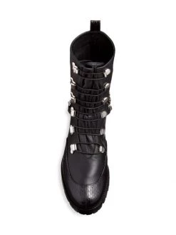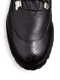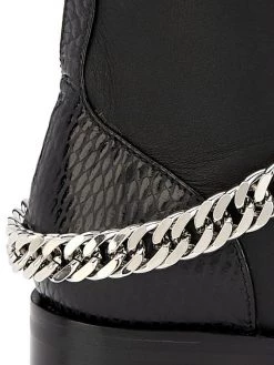 Crafted of a mix of smooth and snakeskin-embossed leathers, these rugged combat boots are finished with chain trim around the heel.