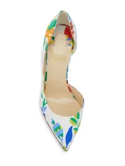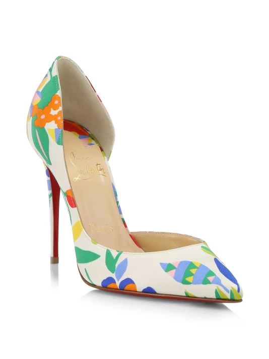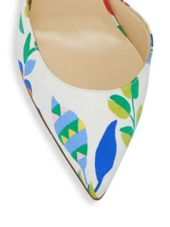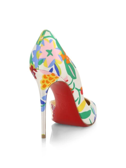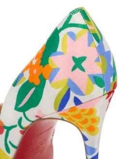 These silk pumps boast a half d’Orsay silhouette with a bold floral pattern.