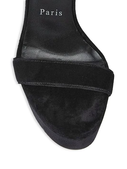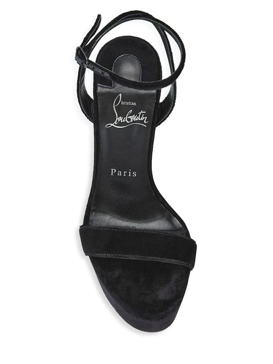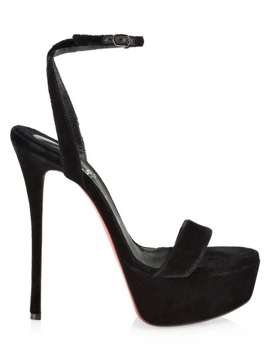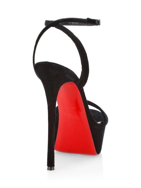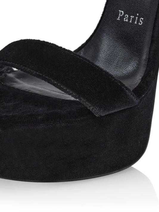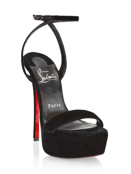 These velvet pumps exude elegance with their bold platform, stiletto heel, and the brand’s iconic red leather soles.