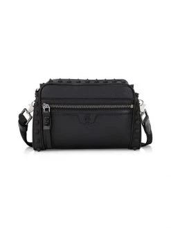 This leather crossbody bag is adorned with studded trim and features an adjustable jacquard-woven logo strap. It is finished with Louboutin’s signature red accents.