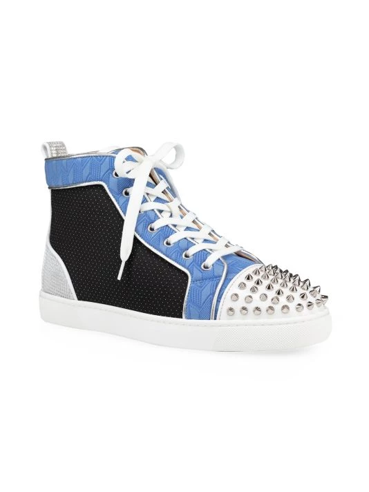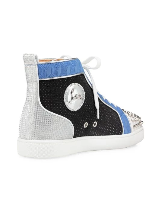 Bold patterns and metallic details define these high-top Christian Louboutin sneakers. Signature silvertone spikes at the toecap are balanced by square rhinestones at the heel, while a mixture of herringbone and polka dots adds an eclectic look to this classic silhouette.