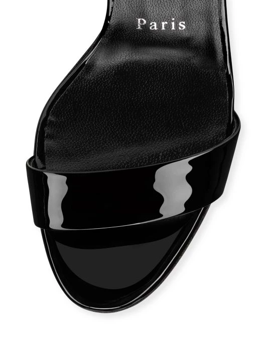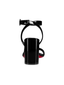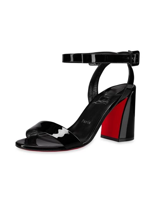 These chic sandals are finished of glossy patent leather, set on top of a statement block heel with Christian Louboutin’s signature red lacquered sole.