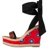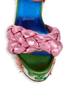 A bold floral print adorns these platform sandals with beaded embellishments and colorblocked details.