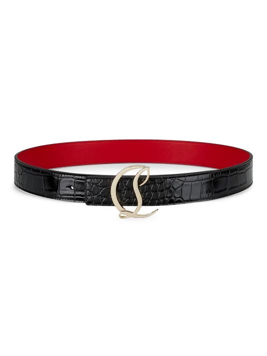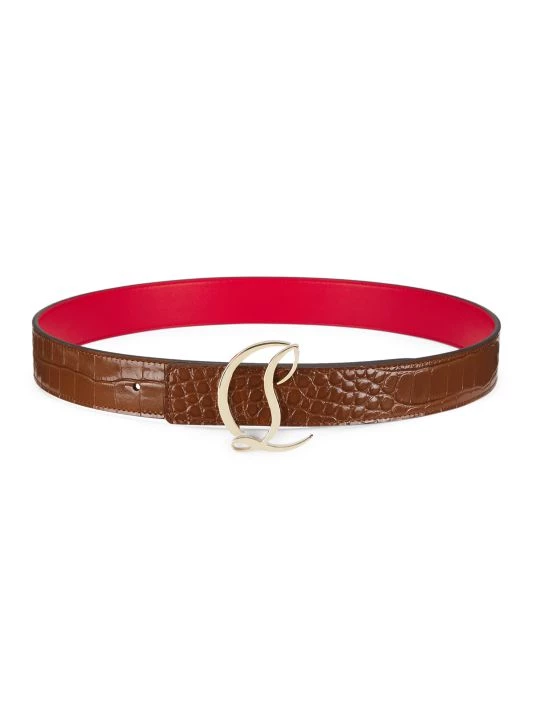 Louboutin’s signature monogram buckle highlights this luxurious crocodile embossed leather belt.