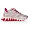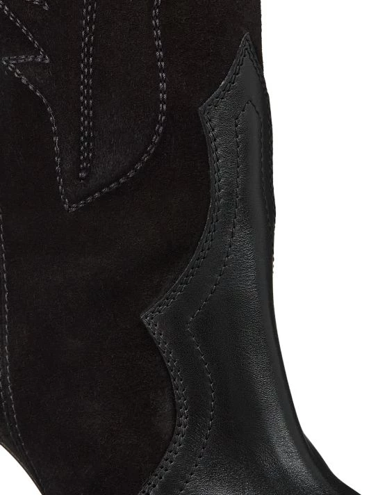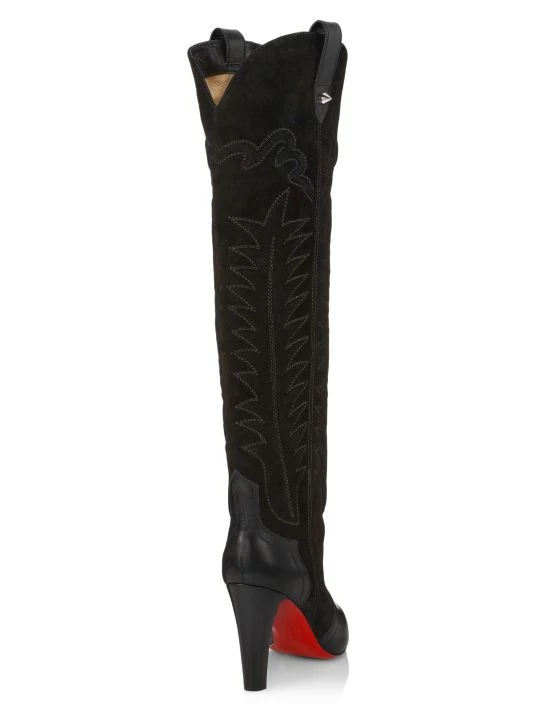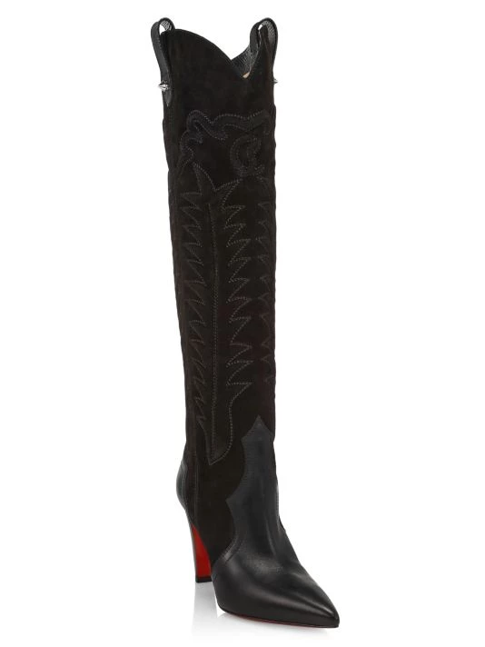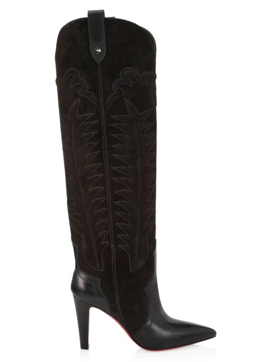Western-style boots show off delicate stitching and are modernized with a bold heel and the brand’s iconic red leather sole.