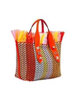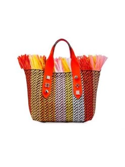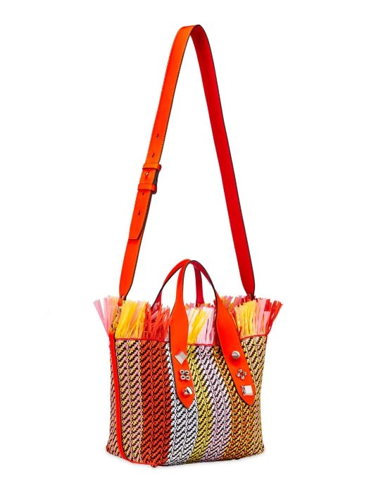 Christian Louboutin’s Small Frangibus tote is made in Italy of multicolored woven straw with wispy fringed edges. This piece is finished with rich leather straps adorned with maxi studs and spikes evoking the iconic Loubinthesky motif.