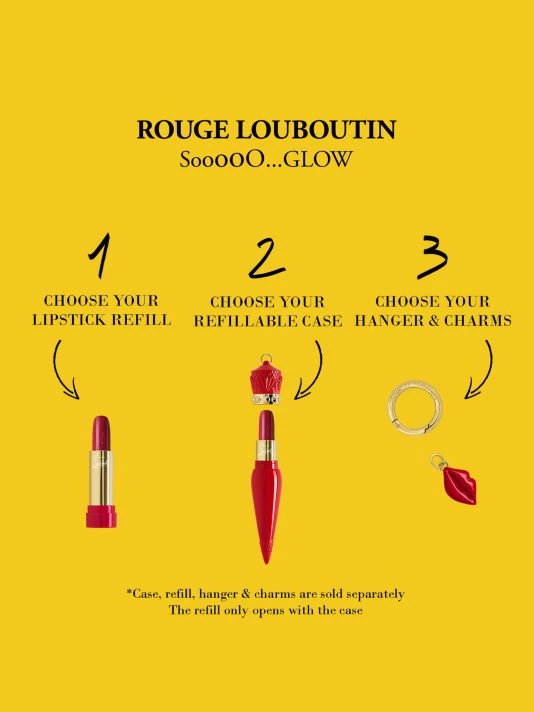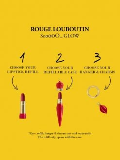 From the Sooooo…Glow Collection. A unique refillable empty case to fill with a favorite Christian Louboutin lipstick refill. Between a beauty object and fashion accessory, the iconic Rouge Louboutin is revisited in three different colors: red, pink, and yellow. One can compose a lipstick by choosing a case and a refill among the 15 different shades. Made in Italy.